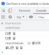 function func() { return new Promise((resolve, reject) => { setTimeout(()=>{ resolve('나 끝났어'); }, 1000); }); } function func2() { console.log("끝나면 할 일"); } function anotherFunc() { console.log("다른 일"); } func().then((resultValue)=>{ console.log("resultValue: ", resultValue); func2(); //끝나면 할 일 }); anotherFunc(); //다른 일 anotherFunc(); //다른 일