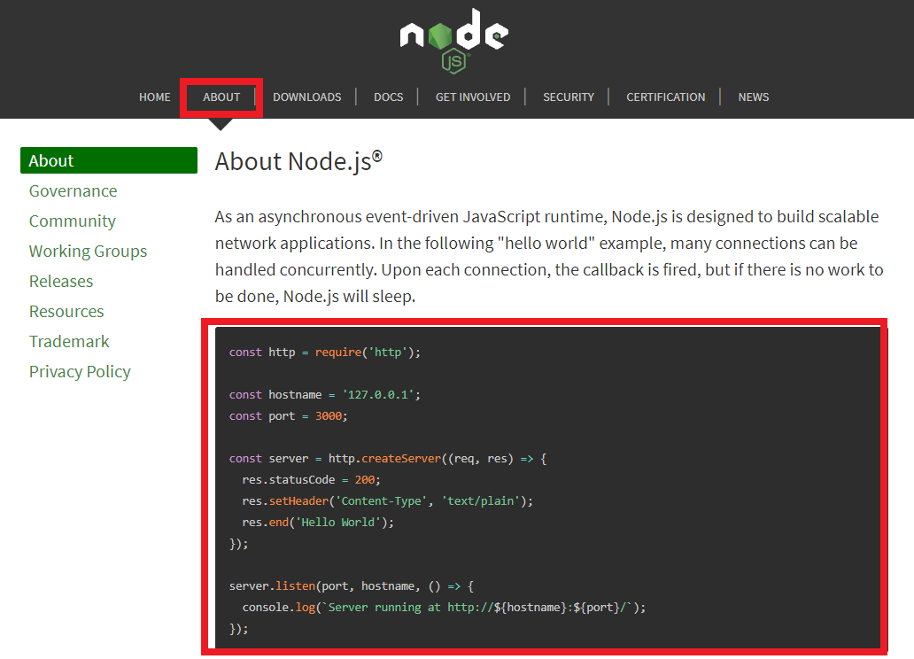 Node js 홈페이지의 ABOUT 메뉴를 선택하면 바로 예제 코드가 나온다. 마우스로 긁어서 가볍게 복사(ctrl+c)해주자.