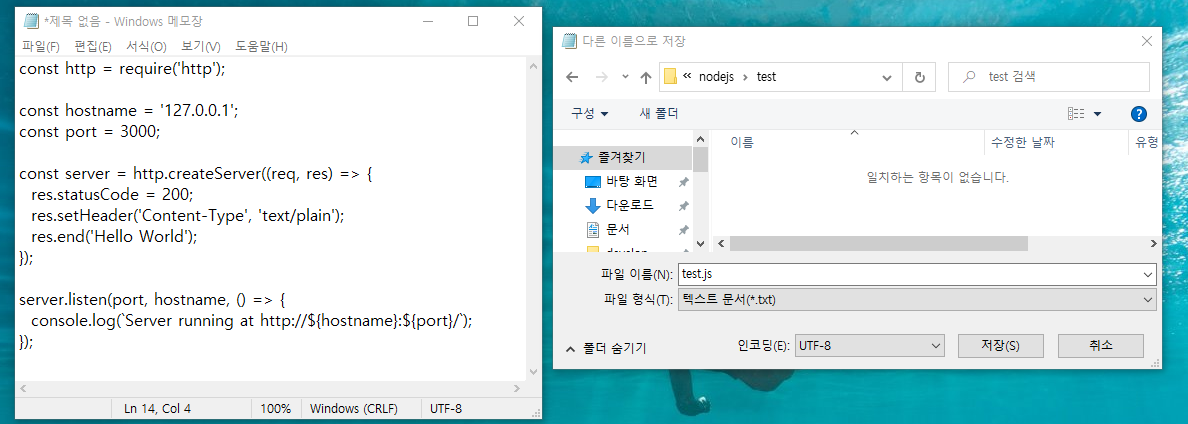 메모장을 열어 복사한 코드를 붙여 넣어(ctrl+v) 주자. 파일 저장할 때 파일 확장자는 '. js'로 끝나도록 입력해준다. 필자는 test.js라고 이름을 지어줬다.
