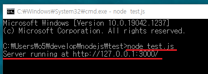 그러면 까만 화면에 흰색 글자가 써진 cmd 창이 띄워지는데 거기에 'node test.js'를 입력하고 엔터를 툭 쳐준다. (test.js는 2번에서 코드를 복붙 해서 저장한 파일 이름이다.)
