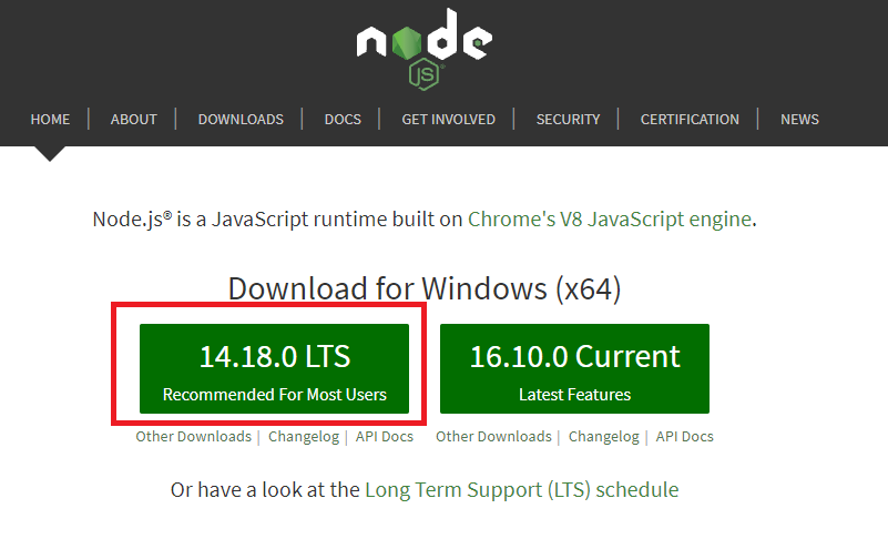 Node js 공식 사이트 링크에 들어가면 나오는 첫 페이지의 다운로드 버튼을 눌러주자.