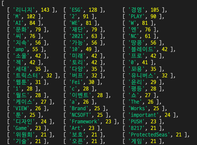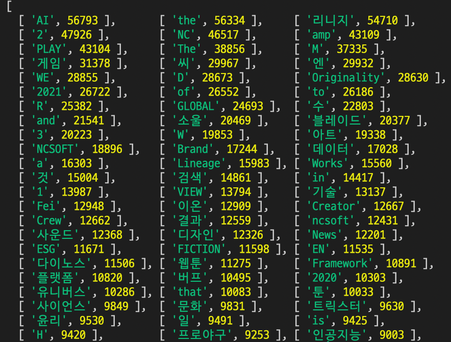 NCSoft 블로그의 모든 페이지를 돌아다닌 다음 얻은 단어들과 메인 페이지에서 얻은 단어들을 비교해보자.