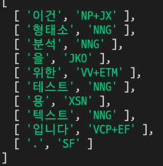 mecab.pos("이건 형태소 분석을 위한 테스트용 텍스트입니다.", function (err, result) {