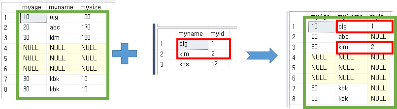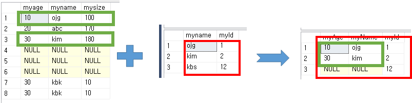SELECT a.myAge, a.myName, b.myId FROM mytable AS a RIGHT OUTER JOIN testtable AS b on a.myname = b.myname