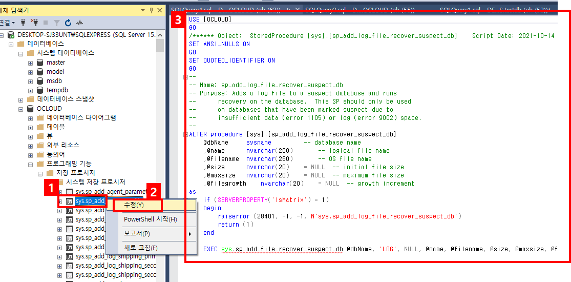 툴에서 아무 프로시저에 (1)마우스 오른쪽 클릭 후, (2)수정을 클릭하면 (3)코드를 볼 수 있다. 보여준다.