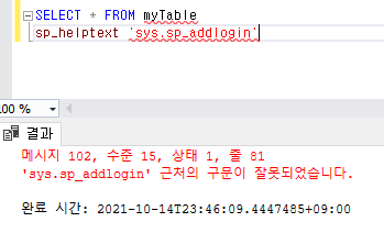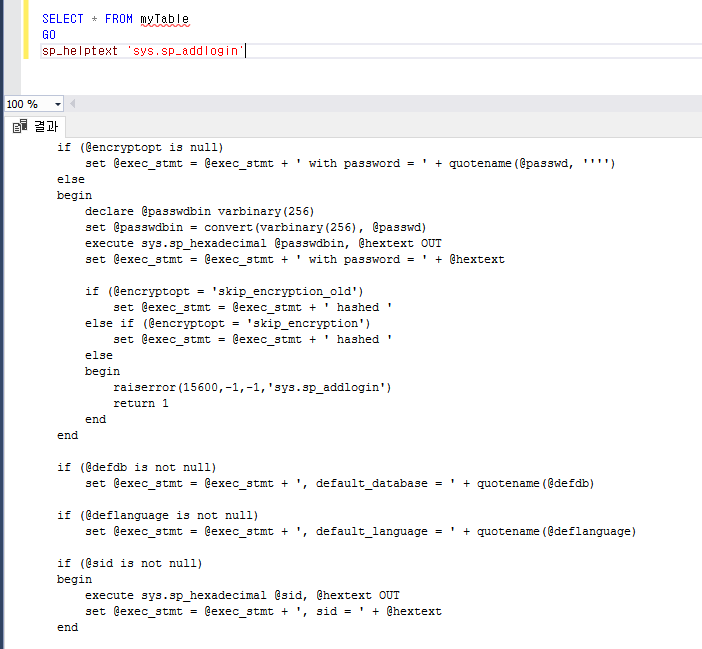만약에 아래와 같이 에러가 발생 시 sp_helptext 쿼리 전에 GO를 써주자