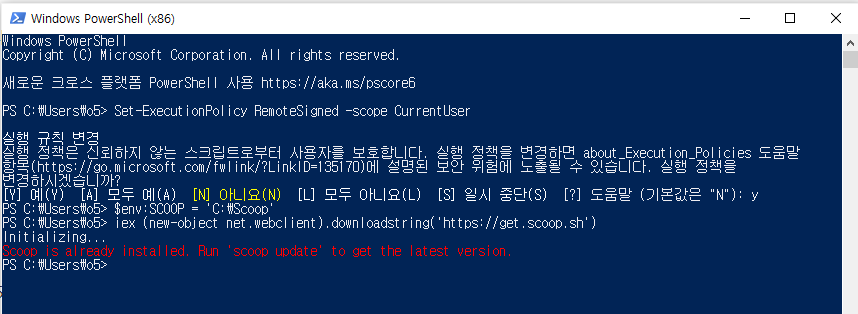 scoop 설치되지 않은 사람은 아래처럼 명령어를 실행시켜 scoop을 설치해주세요.