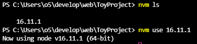 "nvm ls"로 설치된 버전 확인 후에 "nvm use 버전"설치된 버전을 선택한다.
