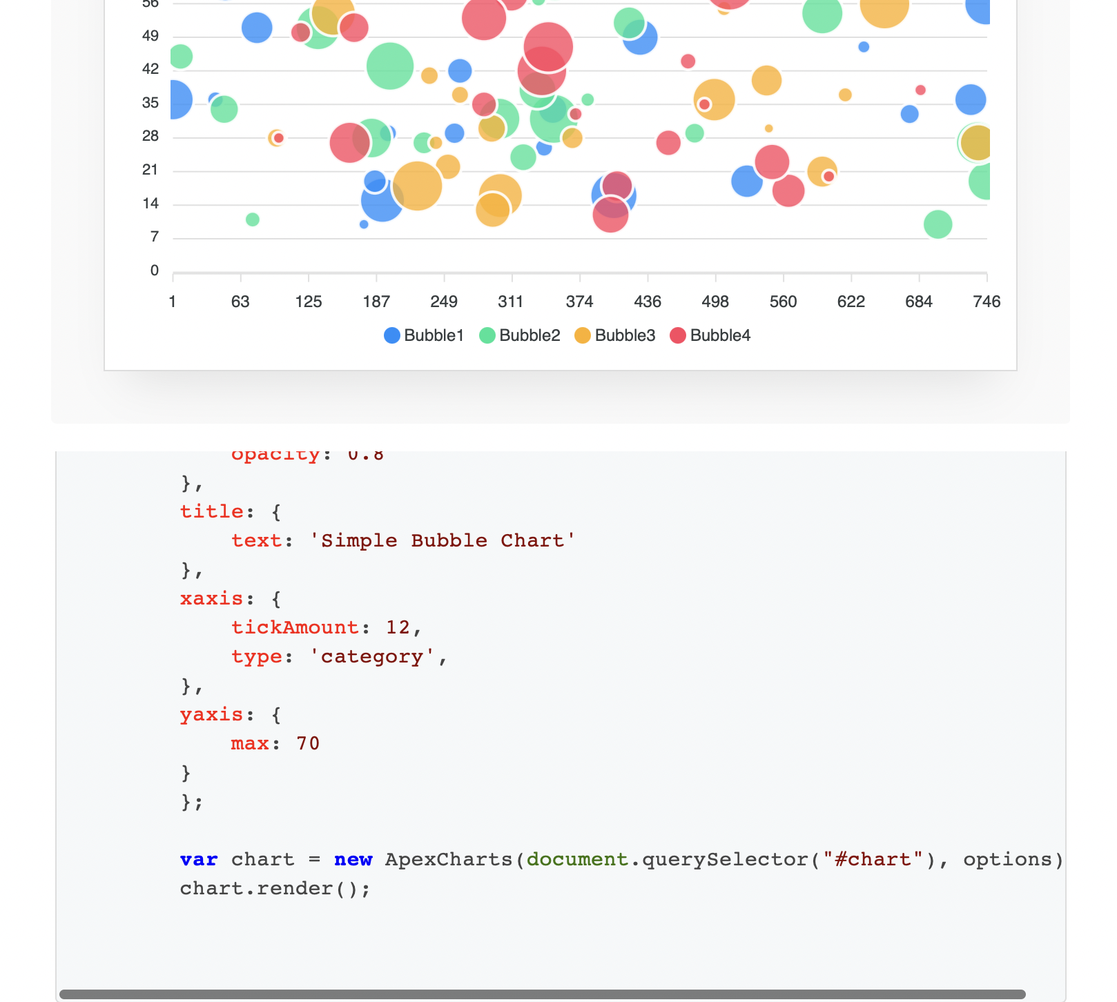다양한 Chart를 그릴 수 있고, Chart 마다 예제 코드를 Vanilla js로 제공을 해준다.